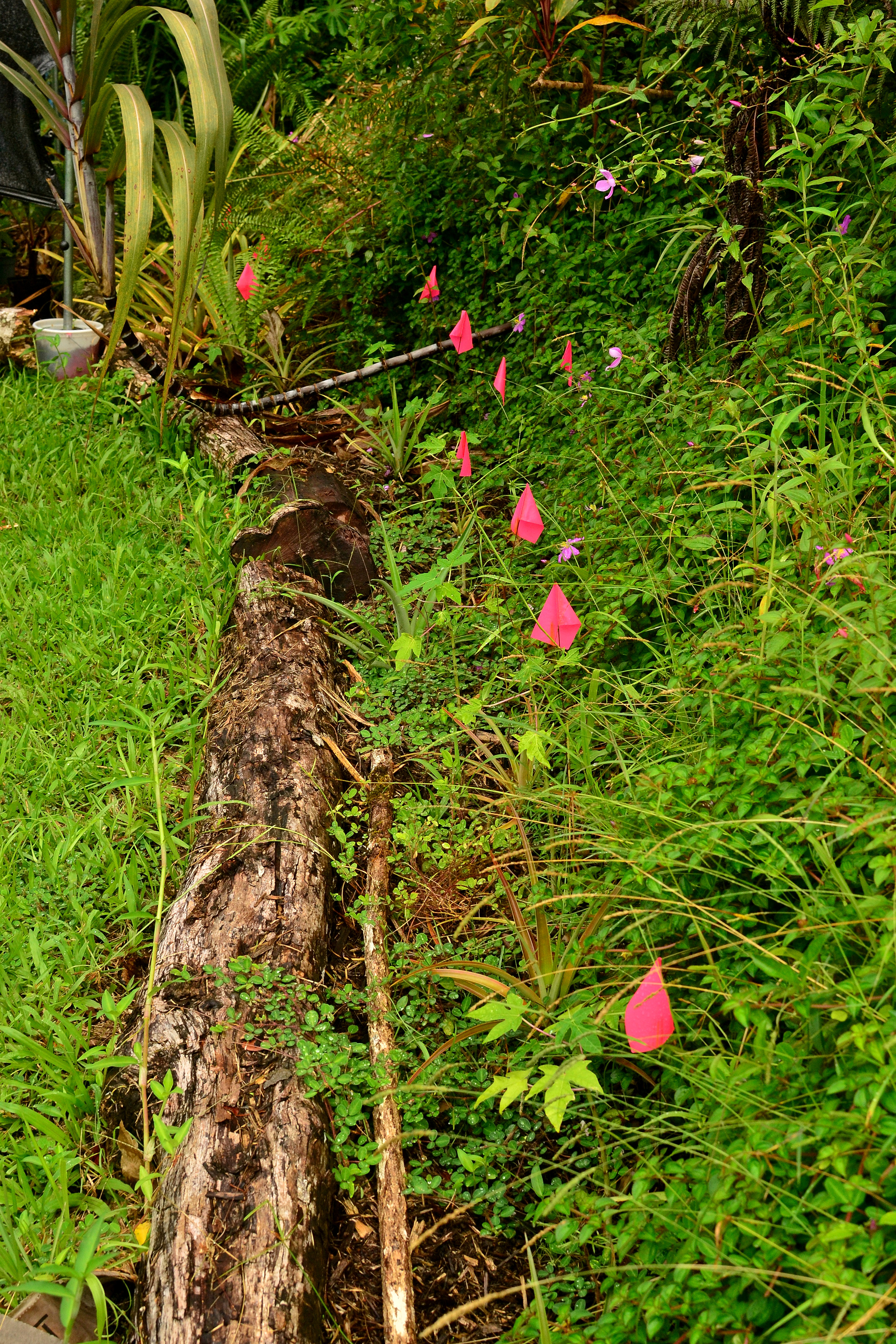 The other place I planted papaya is in a mixed planting area where I am waiting for trees to establish themselves. The trees are: rainbow eucalyptus, soursop, milo, kou, mango, hala, Brazilian cherry, tree tomato, hapu’u, hibiscus, dracaena, strawberry guava, and rollinia. The other plants are: lemongrass, ti, heliconia, Chinese ground orchid, bamboo orchid, gotu kola and long beans. I created mini mounds where I planted beans and squash, the beans did well, but the squash did not, so I ended up planting papaya in the mounds as well. I’m thinking that the other fruit trees will take a few years to start producing, so while I’m waiting I will have papaya harvests for a few years, and cut them down as the other trees need the space. In this area I’m battling weeds, because it’s so open and I am trying to establish some plants as a ground cover, but nothing has been too successful yet. I may just throw in some sweet potato since it grows so well, but who knows. I’ll figure out the right plant some day.