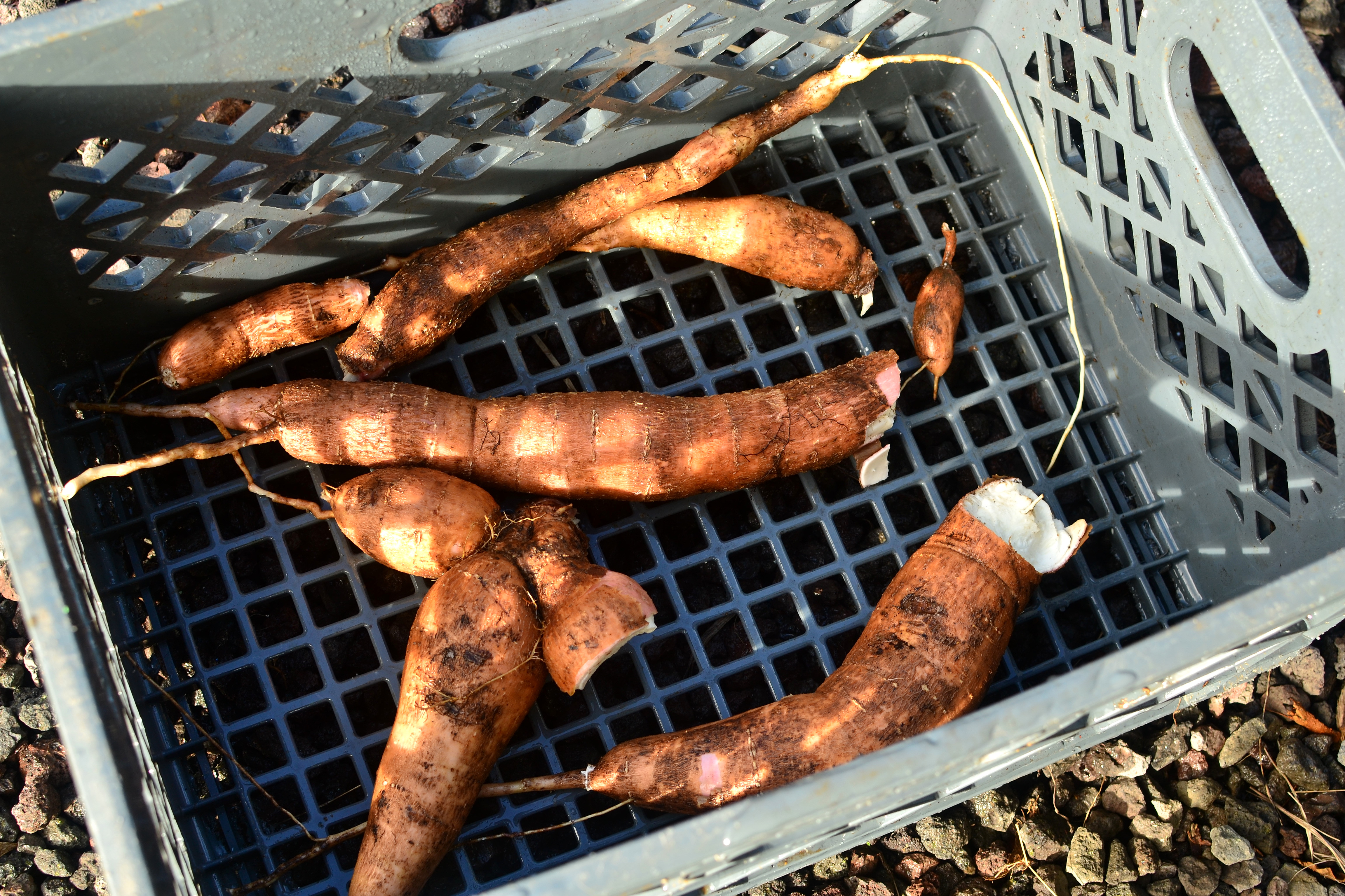 - At this stage the tubers should be washed to remove excess soil. Can be done in a bucket or with running water. I’ll usually use a little luffa sponge to scrub if necessary. These skins will be removed so it is not too important.