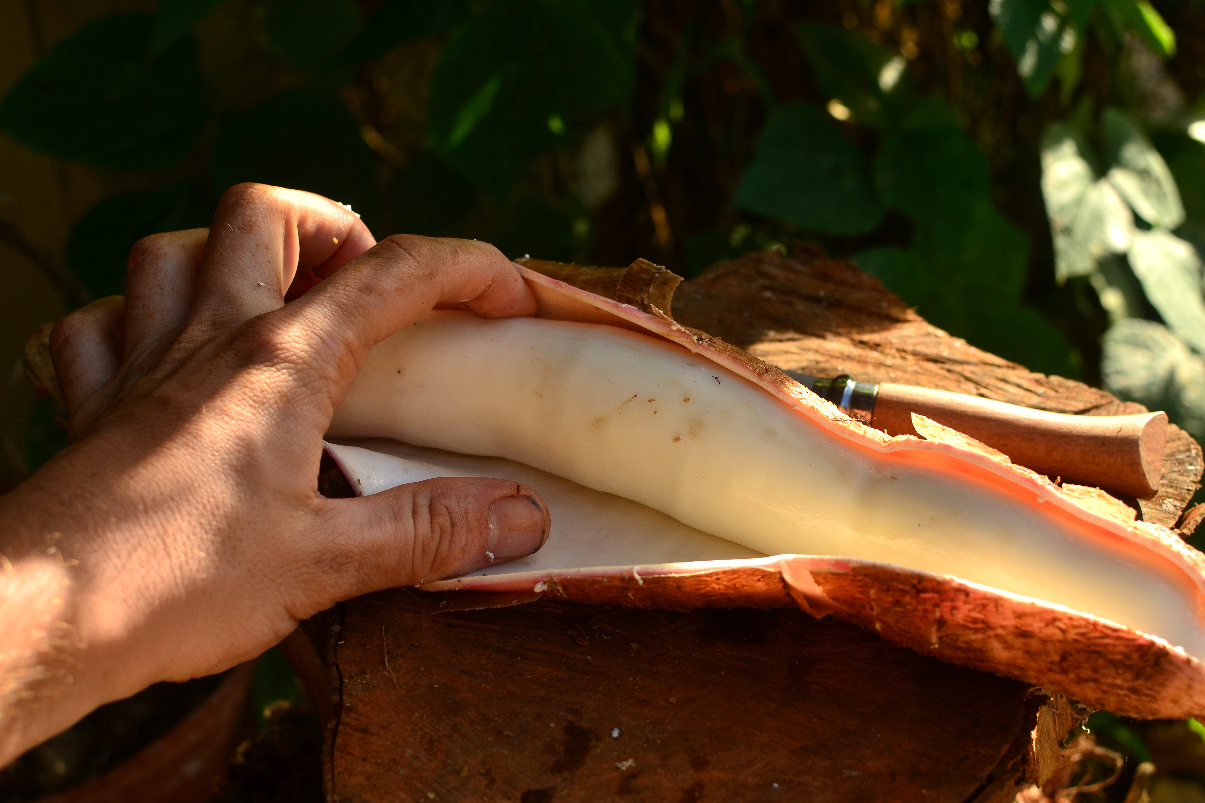 - Grab a knife and slice lengthwise along the whole tuber. You’ll notice the flesh isn’t very thick so you only need to slice that deep.