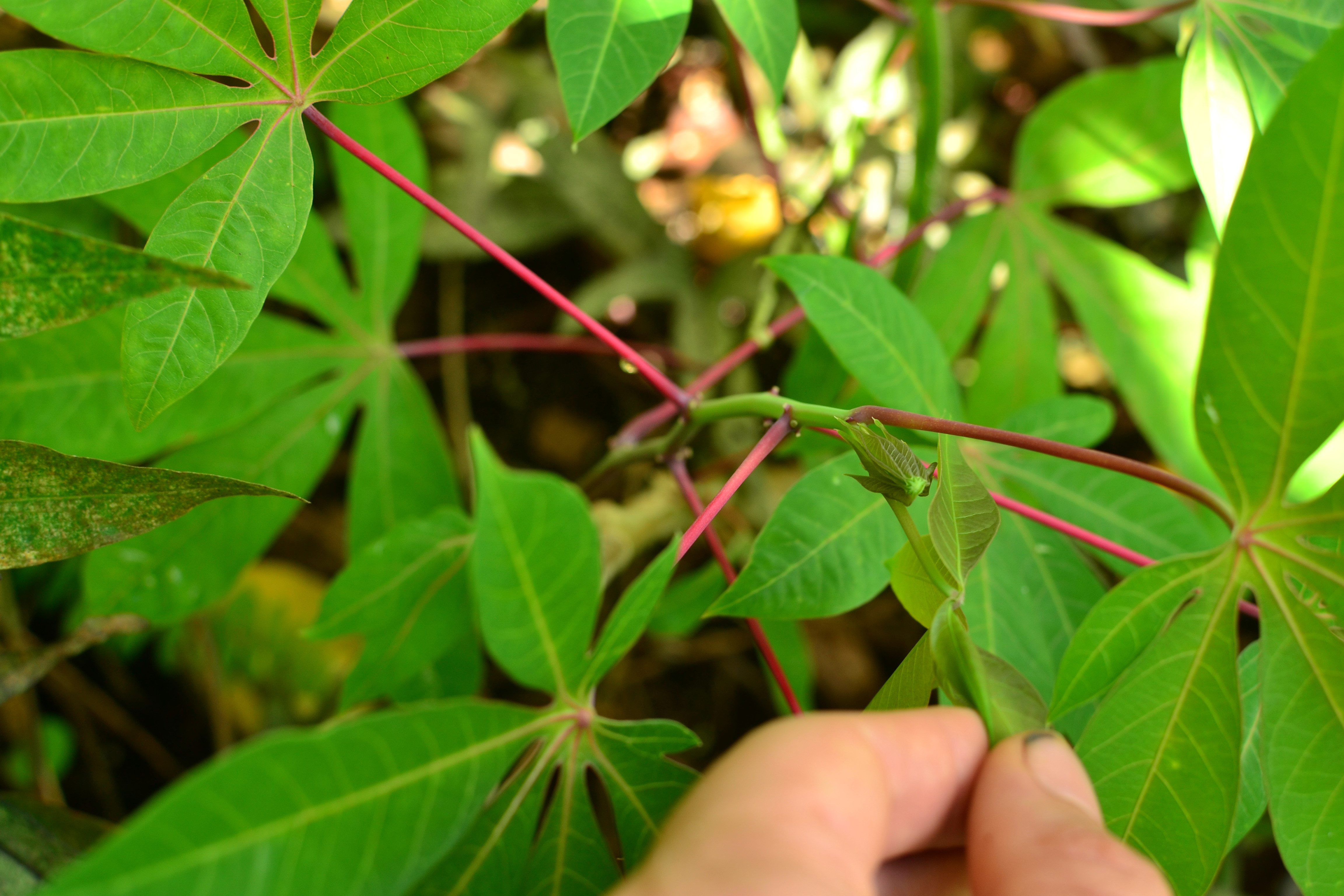 You need to learn the variety you’re growing. Be sure to only dig up the same variety and process it by itself. Don’t mix varieties when you process and cook as they may have different textures and cook times. Variety names do not matter, as I cannot find any information on varieties and cook times, so just stick to your same varieties and learn as you go. I’ve heard on our island we have three varieties: red, yellow and green. But I have at least five distinctly different varieties growing right now, so that shattered that theory. Look at leaf shape, color of stem and leaves, and color of petiole and stipule. Since cassava is typically grown as a clone and not seed, genetic variability doesn’t occur. So these are direct clones someone has cultivated somewhere and it adapted and evolved into separate varieties. In simple: stick to same varieties when preparing and cooking. I like to grow a few plants in close proximity and harvest them all at the same time and re-grow a patch once harvested.